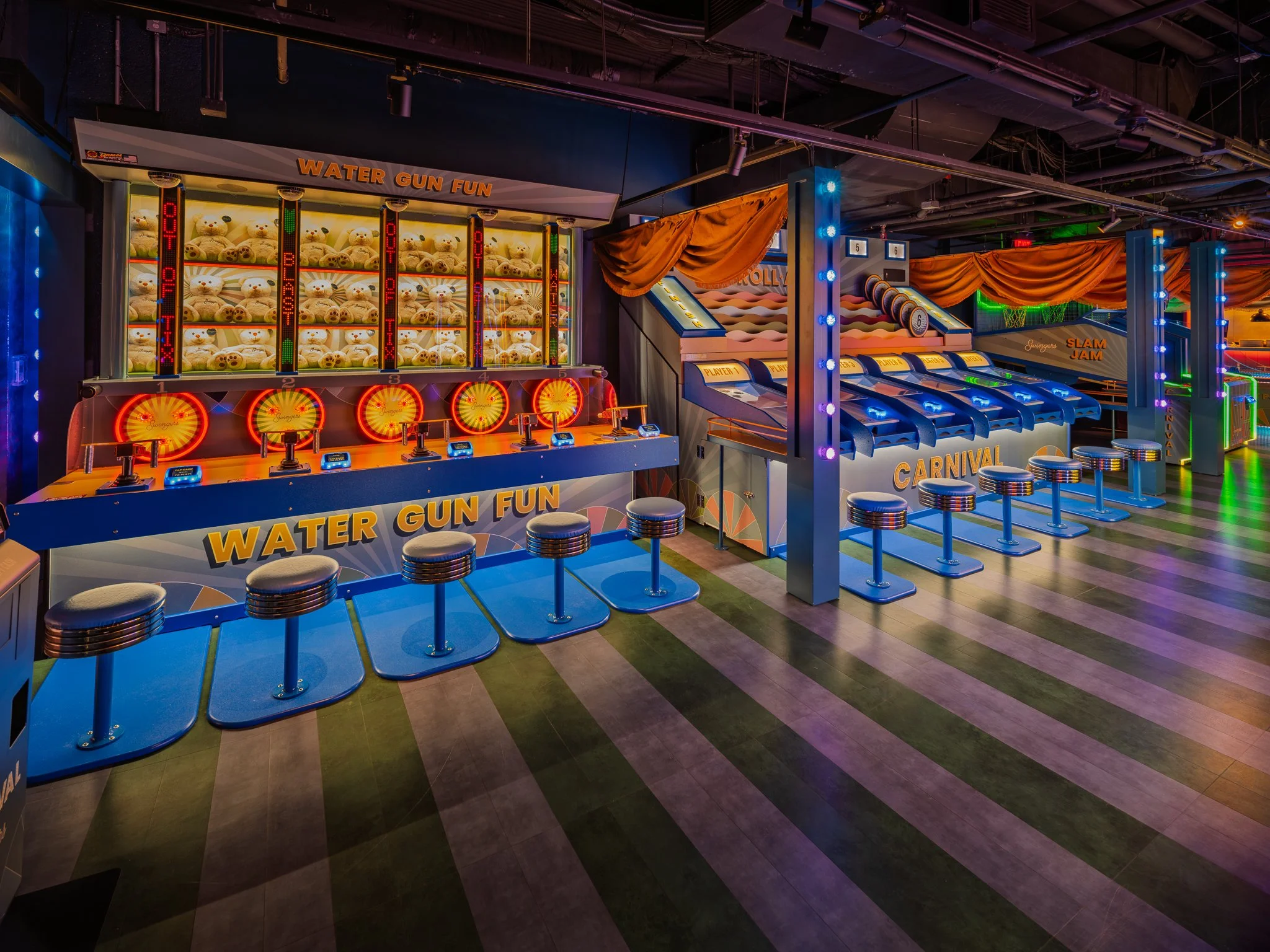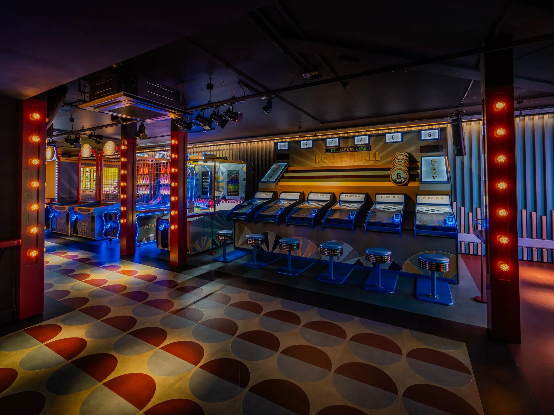 Bringing the Carnival identity into the games and spaces was a key part of the deliverables for each Carnival project across the venues. The game vinyls were bespoke to each location and area, and intertwined with the branded space—whether through